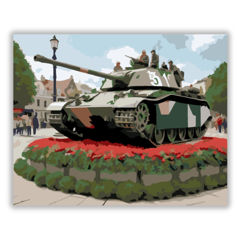 Emlékművé Átalakított Történelmi Tank - számfestő készlet – 40×50 cm (Keret nélkül) A festmény egy emlékművé átalakított, zöld tankot ábrázol, amely egy városi tér közepén áll egy kőtalapzaton. A tank körül piros virágok és zöld növények díszítik a teret,