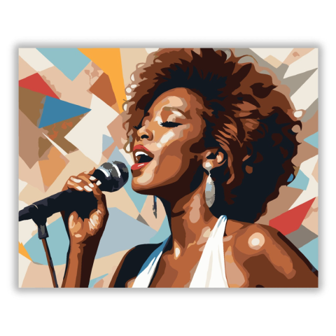 Énekesnő Szenvedélyes Portréja - számfestő készlet – 40×50 cm (Keret nélkül) A festmény egy énekesnőt ábrázol, aki szenvedélyesen énekel mikrofonba, csukott szemekkel és kifejező arckifejezéssel. Az élénk színek és geometrikus háttér dinamikus, modern stí
