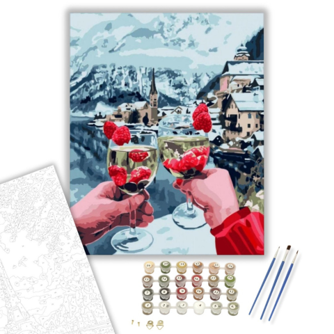 Eperbor - számfestő készlet – 40×50 cm (Keretre feszítve) Ez a festmény egy varázslatos téli tájba kalauzol, ahol a fagyos levegő és a meleg italok találkozása különleges hangulatot teremt. A háttérben megbúvó hegyek és a festői falu történeteket suttogna