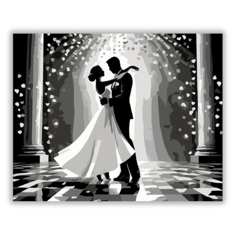 Esküvői Első Tánc Rózsaszirmokkal - számfestő készlet – 40×50 cm (Keret nélkül) A festmény egy párt ábrázol, amint az első táncukat járják esküvőjükön, lágy megvilágításban, rózsaszirmok hullása közepette. A fekete-fehér színek elegáns és időtlen hangulat