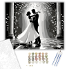 Esküvői Első Tánc Rózsaszirmokkal - számfestő készlet – 40×50 cm (Keretre feszítve) A festmény egy párt ábrázol, amint az első táncukat járják esküvőjükön, lágy megvilágításban, rózsaszirmok hullása közepette. A fekete-fehér színek elegáns és időtlen hang
