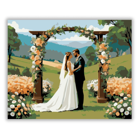 Esküvői Fogadalom a Virágos Domboldalon - számfestő készlet – 40×50 cm (Keret nélkül) A festmény egy szerelmespárt ábrázol, amint fogadalmat tesznek egy virágokkal díszített boltív alatt a domboldalon. A kép meleg, természetes színekkel és gyönyörű tájjal