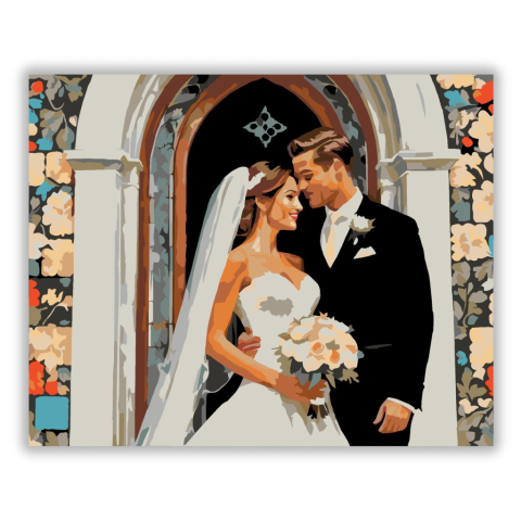 Esküvői Pár a Kápolna Előtt - számfestő készlet – 40×50 cm (Keret nélkül) A festmény egy elegáns esküvői párt ábrázol, ahol a menyasszony csipkefátyolos ruhát visel, a vőlegény pedig klasszikus fekete öltönyt, miközben egy régi kápolna előtt állnak. A hát
