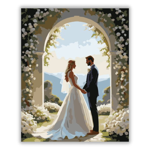 Esküvői Pár a Virágkapu Alatt - számfestő készlet – 40×50 cm (Keret nélkül) A festmény egy esküvői párt ábrázol, amint kéz a kézben állnak egy fehér virágokkal díszített boltív alatt. A lágy napsütés és a pasztellszínek romantikus, idilli hangulatot terem