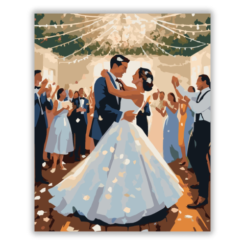 Esküvői Tánc Tündérfények Alatt - számfestő készlet – 40×50 cm (Keret nélkül) A festmény egy friss házaspárt ábrázol, amint táncolnak egy ünnepi fogadáson, körülöttük tapsoló vendégekkel és repülő virágszirmokkal. A meleg fények és a tündérfények romantik