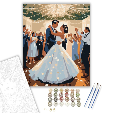 Esküvői Tánc Tündérfények Alatt - számfestő készlet – 40×50 cm (Keretre feszítve) A festmény egy friss házaspárt ábrázol, amint táncolnak egy ünnepi fogadáson, körülöttük tapsoló vendégekkel és repülő virágszirmokkal. A meleg fények és a tündérfények roma
