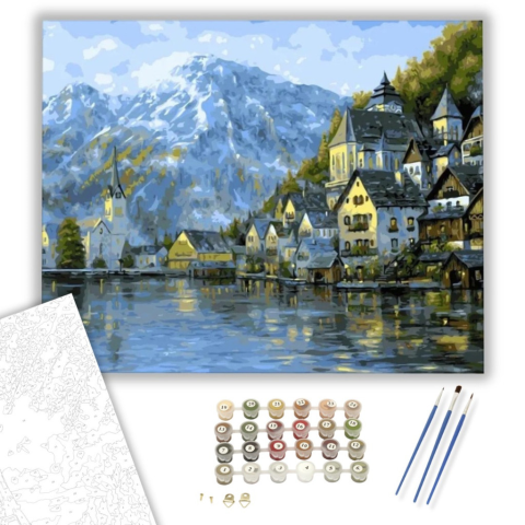 Esti táj - számfestő készlet – 40×50 cm (Keretre feszítve) Ez a festmény nyugodt, békés hangulatot áraszt, amely elrepít egy távoli, mesebeli világba. A képen megelevenedő falu mintha egy rejtett történetet mesélne a múltból, ahol minden ház és utca saját