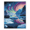 Északi Fények és Távoli Galaxis - számfestő készlet – 40×50 cm (Keret nélkül) A festmény egy békés sarkvidéki partot ábrázol sima jégtáblákkal, az égen hullámzó sarki fényekkel és a horizont felett ragyogó távoli galaxissal. A kép színvilágát a hideg kéke