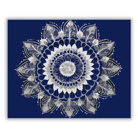 Ezüst Virág Mandala - számfestő készlet – 40×50 cm (Keret nélkül) A festmény egy ezüstös mandalát ábrázol, amely mély indigó háttéren ragyog. A finom virágos geometria és a halványan csillogó részletek harmóniát és eleganciát sugároznak. Ez a kép a nyugal