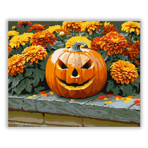 Faragott tök őszi virágok között - számfestő készlet – 40×50 cm (Keret nélkül) Ez a festmény egy faragott töklámpást ábrázol, amely őszi virágok, például krizantémok között pihen. A narancssárga tök élénk színei harmonizálnak a virágok sárga és narancsszí
