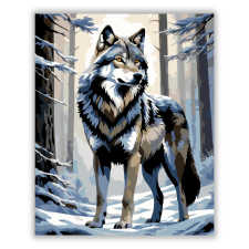 Farkas a Havas Erdőben - számfestő készlet – 40×50 cm (Keret nélkül) A festmény egy méltóságteljes farkast ábrázol, amint a havas erdőben áll. Szőrzete ezüstösen csillog a hófödte tájban, miközben aranyszínű szemei ragyognak. A kép a természet erejét és a