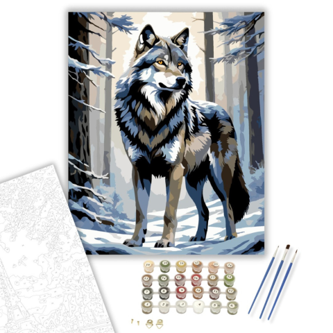 Farkas a Havas Erdőben - számfestő készlet – 40×50 cm (Keretre feszítve) A festmény egy méltóságteljes farkast ábrázol, amint a havas erdőben áll. Szőrzete ezüstösen csillog a hófödte tájban, miközben aranyszínű szemei ragyognak. A kép a természet erejét
