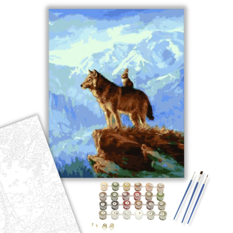 Farkas és Nyúl - számfestő készlet – 40×50 cm (Keretre feszítve) A festmény egy különleges, békés harmóniát sugároz, ahogy a farkas és a nyúl együtt szemlélik a tájat. Egy elgondolkodtató történet bontakozik ki előttünk, ahol az ellentétek találkozása új
