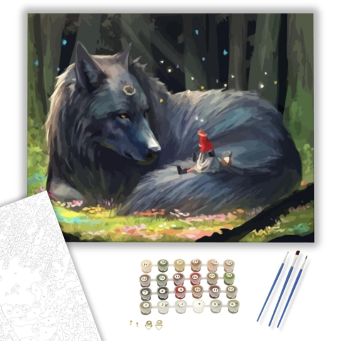 Farkas mese - számfestő készlet – 40×50 cm (Keretre feszítve) A festmény varázslatos atmoszférát teremt, amely elrepít egy mesebeli világba. Egy különös történet bontakozik ki a hatalmas farkas és a mellette pihenő apró figura között, mintha egy titkos sz