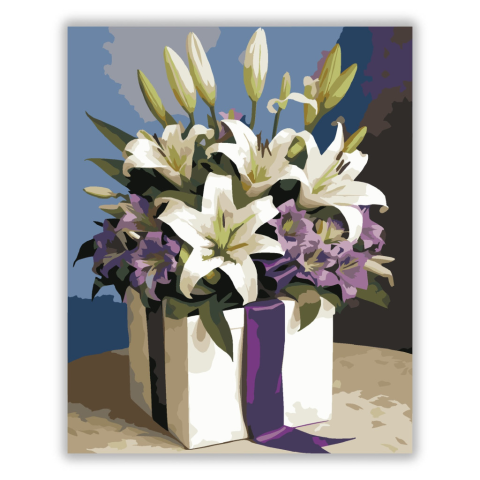 Fehér és Lila Liliomok Ajándékdobozban - számfestő készlet – 40×50 cm (Keret nélkül) A kép egy elegáns ajándékdobozt ábrázol, melyben fehér és lila liliomok pompáznak. A virágok kontrasztos színei és a selyemszalag finom összhangot teremtenek. Az elrendez