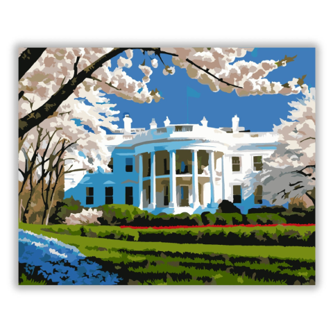 Fehér Ház Tavaszi Virágzásban - számfestő készlet – 40×50 cm (Keret nélkül) A festmény a Fehér Házat ábrázolja Washington D.C.-ben, virágzó cseresznyefák és egy lobogó amerikai zászló keretezésében. A kék tavaszi égbolt és a rózsaszín virágok friss, élénk