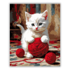 Fehér Kiscica Piros Fonallal - számfestő készlet – 40×50 cm (Keret nélkül) A festmény egy játékos fehér kiscicát ábrázol, amint egy piros fonalgombolyaggal játszik. A háttérben meleg, földszínek dominálnak, melyek kontrasztot teremtenek a cica hófehér bun