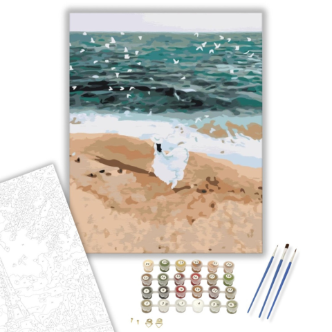 Fehér ruhás lány - számfestő készlet – 40×50 cm (Keretre feszítve) Ez a festmény a tengerparti nyugalom és szabadság érzését kelti életre. Egy magányos alak sétál a homokos parton, miközben a hullámok csendesen sodródnak. A kék és homokszínek harmóniája m