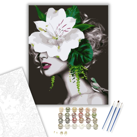 Fehér virágos arc - számfestő készlet – 40×50 cm (Keretre feszítve) Készíts gyönyörű műalkotásokat, előzetes festő tudás nélkül! Éld át az alkotás gyönyörű pillanatait és varázslatos hangulatát! Akkor is gyönyörű festményeket hozhatsz létre, ha még nem fe