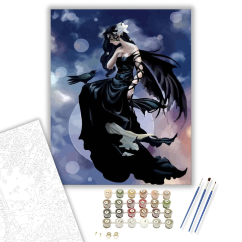 Fekete angyal - számfestő készlet – 40×50 cm (Keretre feszítve) A festmény titokzatos és varázslatos légkört teremt, amely elbűvöli a nézőt. Egy történet bontakozik ki egy misztikus alak körül, aki egy holló társaságában lebeg az éjszakai égbolton. A mély
