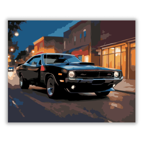 Fekete Dodge Challenger Éjszakai Városi Szenében - számfestő készlet – 40×50 cm (Keret nélkül) A festmény egy fekete Dodge Challenger autót ábrázol, amely egy csendes városi utcán áll éjszaka. A kép sötét tónusai és az utcai lámpák meleg fényei drámai han