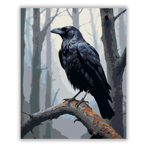 Fekete Holló az Erdőben - számfestő készlet – 40×50 cm (Keret nélkül) A festmény egy fekete hollót ábrázol, amint egy kopott faágon ül egy ködös erdőben. Tollai fényesek és rejtélyes fényben csillognak, ami misztikus hangulatot teremt. A kép a természet t