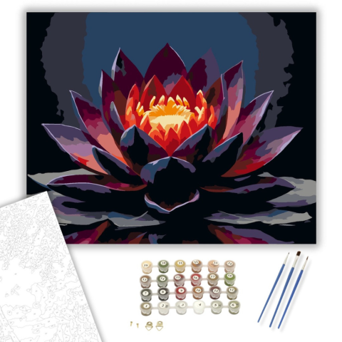 Fekete Lótusz Tüzes Közegben - számfestő készlet – 40×50 cm (Keretre feszítve) A festmény egy fekete lótuszvirágot ábrázol, amely lángok közül emelkedik ki. A magas kontrasztú, drámai színek kiemelik a virág újjászületését és ellenállását. A kép az újjász