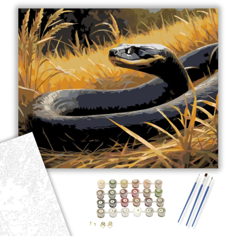 Fekete Mamba a Szavannán - számfestő készlet – 40×50 cm (Keretre feszítve) A festmény egy fekete mambát ábrázol, amint aranyló fűben kúszik a szavannán. A kontrasztos fekete és arany színek drámai és titokzatos hangulatot keltenek. A kép a vadon veszélyes