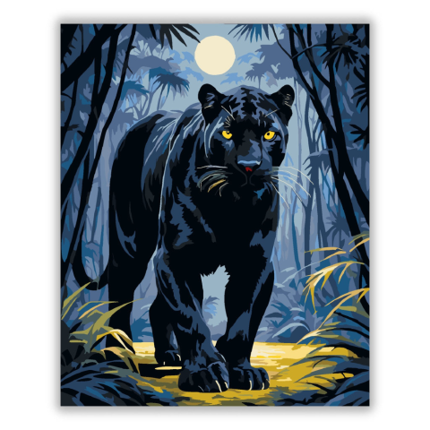 Fekete Párduc a Dzsungelben - számfestő készlet – 40×50 cm (Keret nélkül) A festmény egy fekete párducot ábrázol, amint a holdfényes dzsungelben sétál. A sötét kék és fekete árnyalatok kontrasztot alkotnak a párduc aranyló szemeivel, misztikus hangulatot