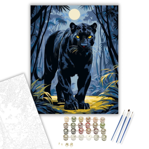 Fekete Párduc a Dzsungelben - számfestő készlet – 40×50 cm (Keretre feszítve) A festmény egy fekete párducot ábrázol, amint a holdfényes dzsungelben sétál. A sötét kék és fekete árnyalatok kontrasztot alkotnak a párduc aranyló szemeivel, misztikus hangula