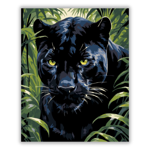 Fekete Párduc a Holdfényes Dzsungelben - számfestő készlet – 40×50 cm (Keret nélkül) A festmény egy fekete párducot ábrázol, amint lopakodik a holdfényben fürdő dzsungelben. A fekete és zöld árnyalatok kontrasztja kiemeli a párduc sárga szemének ragyogásá