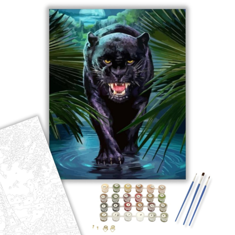 Fekete párduc - számfestő készlet – 40×50 cm (Keretre feszítve) Ez a festmény egy titokzatos és erőteljes világba kalauzol, ahol a vadon uralkodója lép elő. A kép történetet mesél egy rejtett dzsungel mélyéről, ahol minden mozdulatnak jelentősége van. Az