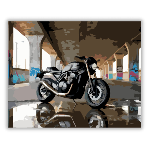 Fekete Street Motor Graffitis Felüljáró Alatt - számfestő készlet – 40×50 cm (Keret nélkül) A festmény egy matt fekete street motort ábrázol, amely egy graffiti borította felüljáró alatt parkol. A kompozíció kontrasztos színvilága kiemeli a motor sötét tó