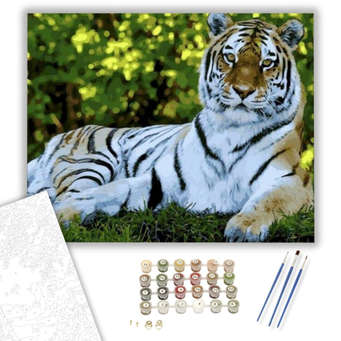 Fekvő tigris - számfestő készlet – 40×50 cm (Keretre feszítve) A festmény egy nyugodt, mégis erőt sugárzó jelenetet ábrázol, amely azonnal magával ragadja a nézőt. A tigris tekintetéből áradó bölcsesség és nyugalom egy titokzatos történetet mesél el. A zö