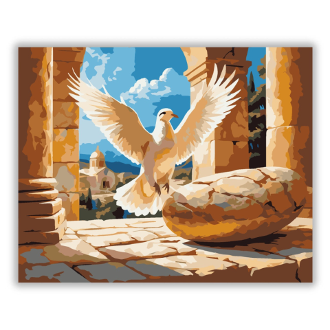 Feltámadás Szimbóluma - számfestő készlet – 40×50 cm (Keret nélkül) A festmény egy elmozdított követ ábrázol, amely mögül aranyló fény árad, és egy galamb repül fölötte. A kép világos arany és kék árnyalatai békés, ünnepélyes hangulatot árasztanak. A komp