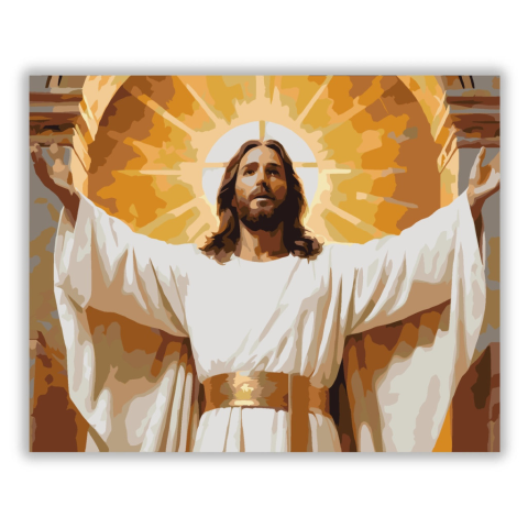 Feltámadó Jézus - számfestő készlet – 40×50 cm (Keret nélkül) A festmény Jézust ábrázolja, amint fehér ruhában, kitárt karokkal áll, körülötte aranyló fény ragyog. A kompozíció világos és meleg színekben pompázik, ami spirituális és felemelő hangulatot ár