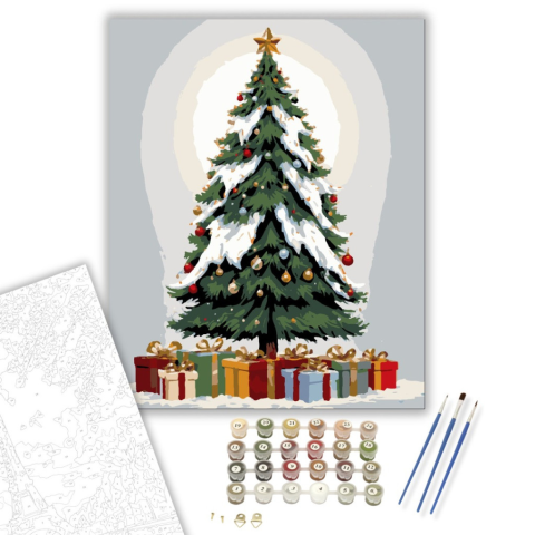 Fenséges Karácsonyi Ünnep - számfestő készlet – 40×50 cm (Keretre feszítve) Egy fenséges, hóval borított karácsonyfa emelkedik ki az ünnepi díszítés varázsában, a csillogó díszek és a csillaggal koronázott csúcs méltóságteljesen ragyog. A háttér puha szín