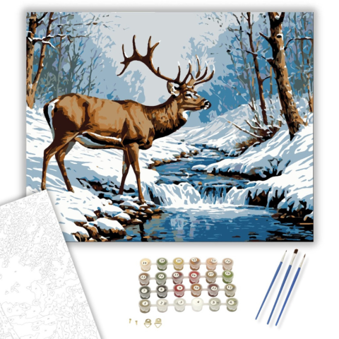 Fenséges Téli Szarvas – számfestő készlet – 40×50 cm (Keretre feszítve) A képen egy impozáns szarvas áll a hóval borított, csendes erdei patak mellett, mintha csak a tél szívdobbanását hallgatná. A kék és fehér árnyalatok nyugalmat árasztanak, a háttérben