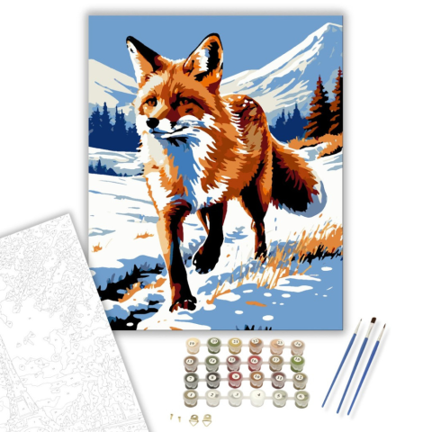 Fenséges Vörös Róka - számfestő készlet – 40×50 cm (Keretre feszítve) A képen egy magabiztos vörös róka sétál hóborította tájon, kecses lépteivel hagyva nyomot maga után. A hó fehérsége és a háttér hűvös kékessége varázslatos kontrasztot alkot a róka mele