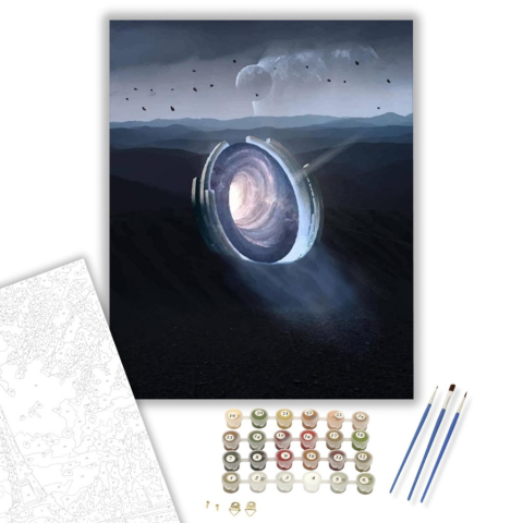 Fény - számfestő készlet – 40×50 cm (Keretre feszítve) A festmény misztikus légkört áraszt, amely az ismeretlenbe való utazás izgalmát idézi elő. Egy távoli világ kapuja nyílik meg előttünk, amely a képzelet határait feszegeti. A sötét és mély tónusok kon