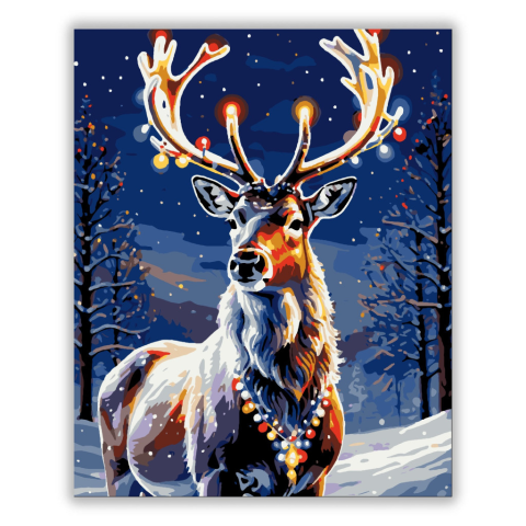 Fénylő Téli Csodák - számfestő készlet – 40×50 cm (Keret nélkül) E kép középpontjában egy impozáns szarvas áll, agancsait színes fények övezik, mint egy ünnepi ékesség. A háttérben a hóval borított fák és az éjszakai égbolt bűvös hangulatot teremt, ragyog