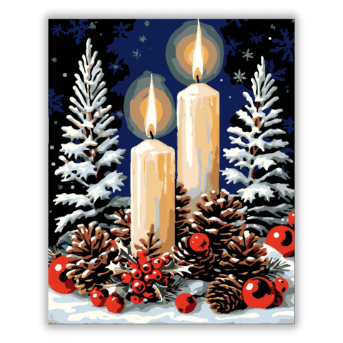 Fénylő Téli Gyertyafény - számfestő készlet – 40×50 cm (Keret nélkül) A képen két ragyogó gyertya áll fenyőtobozok és csillogó bogyók ölelésében, miközben hófödte fenyőágak keretezik az ünnepi varázslatot. A sötétkék égbolt derengő hópelyhek táncával adja