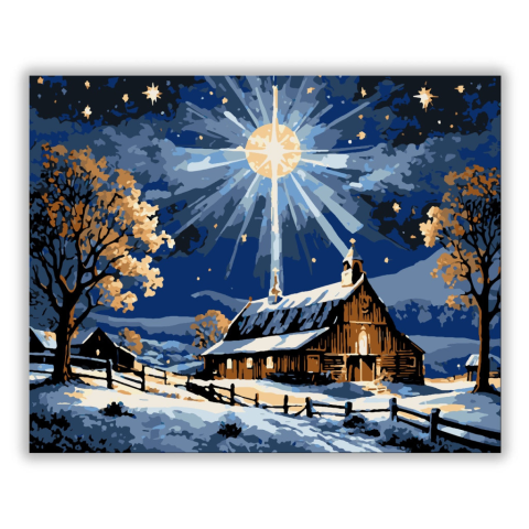 Fénylő Téli Temlom - számfestő készlet – 40×50 cm (Keret nélkül) A képen egy magányos, hóval borított templom áll az éjszakai égbolt alatt, ahol a csillagok ragyogása világítja meg a tájat. Az ég mélykék árnyalatai és a hó fehér csillanásai varázslatos ko