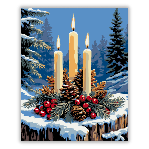 Fenyőillatú Gyertyafény - számfestő készlet – 40×50 cm (Keret nélkül) Három világító gyertya emelkedik a havas fenyőágakkal és tobozokkal díszített kompozíció középpontjában, finom meleget árasztva a téli éjszakába. A kék háttér, ahol fenyvesek sziluettje