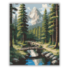 Fenyves Erdő Hegyi Táj - számfestő készlet – 40×50 cm (Keret nélkül) A festmény egy békés erdei tisztást ábrázol, amelyet magasba nyúló fenyőfák vesznek körül, egy kis fa híd vezet át a tiszta patak felett. A színvilág élénk zöldekben és hűvös kékekben po