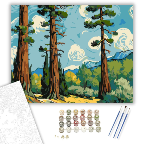 Fenyvesek Szimfóniája - számfestő készlet – 40×50 cm (Keretre feszítve) A kép fenséges fenyőfákat ábrázol egy vibráló tájképben, Van Gogh stílusának varázsával. Az élénk kék és zöld színek, valamint a lendületes ecsetvonások dinamikus harmóniát teremtenek