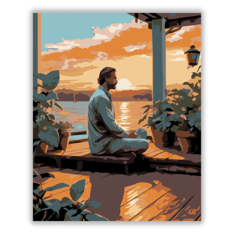 Férfi Jóga Pózban Naplementében - számfestő készlet – 40×50 cm (Keret nélkül) A festmény egy férfit ábrázol meditációs pózban, egy fa teraszon ülve, naplementében. A meleg narancs és arany színek békés, harmonikus hangulatot teremtenek, miközben a környez