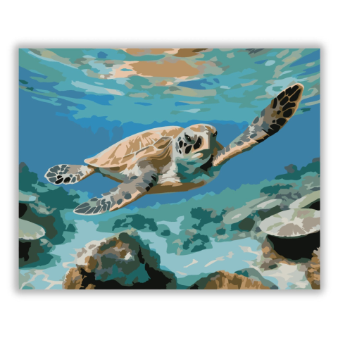 Fiatal Tengeri Teknős Kalandja - számfestő készlet – 40×50 cm (Keret nélkül) A festmény egy fiatal tengeri teknőst ábrázol, amint a sekély, türkizkék vízben úszik. A napfény játékosan törik meg a víz felszínén, nyugodt és harmonikus hangulatot teremtve. A