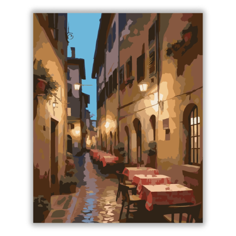 Firenzei Trattoria a Sikátorban - számfestő készlet – 40×50 cm (Keret nélkül) A festmény egy firenzei sikátorban található kis trattoriát ábrázol, piros-fehér kockás abroszokkal és borospoharakkal. A meleg fények és a hangulatos utcai lámpák barátságos, m