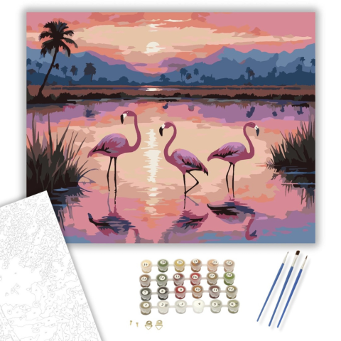 Flamingók a Napfelkeltében - számfestő készlet – 40×50 cm (Keretre feszítve) A festmény három flamingót ábrázol, amint egy sekély lagúnában gázolnak, miközben a napfelkelte rózsaszín és narancs árnyalatokkal festi meg az eget. A vízen megjelenő tükröződés